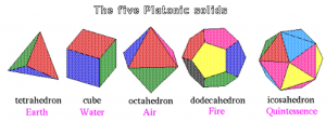 The Aristotelian description of nature was influenced by Pythagorean idealism. Plato suggested a mathematically perfect cosmos, in which the four fundamental elements – earth, fire, water, and air – are associated with regular solids. For example, fire is associated with a twelve-sided shape called a dodecahedron. Aristotle refined this cosmology and added the “aether”, or quintessence, to account for the void present in the atomist view and thus rendering the cosmos finite. In Aristotle’s view, all matter is at its natural state when at rest, and all objects will naturally fall back to Earth when displaced. Earth is naturally at the center in this system, in line with a geocentric viewpoint. This geocentric cosmology is counter to the plurality of worlds advocated by the atomists.