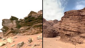 Today, Mars is a barren world with a thin atmosphere dominated by CO2. Photos of the surface Mars taken by the rovers show a landscape that looks similar to some deserts on Earth (Figure 8). Can you tell which picture is of Earth and which is of Mars (before you read the caption)?