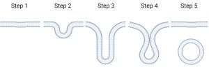 Vesicles can form in a natural environment due to what is known as wet/dry cycling (Figure 3). When an environment is dry, the lipids form sheets (Step 1), however when they get wet again (like after it rains) the sheets can slowly bud off (Steps 2-4) and eventually form vesicles (Step 5) and encapsulate whatever material was between the lipid sheets. This material can include molecules important to the origin of the first life!