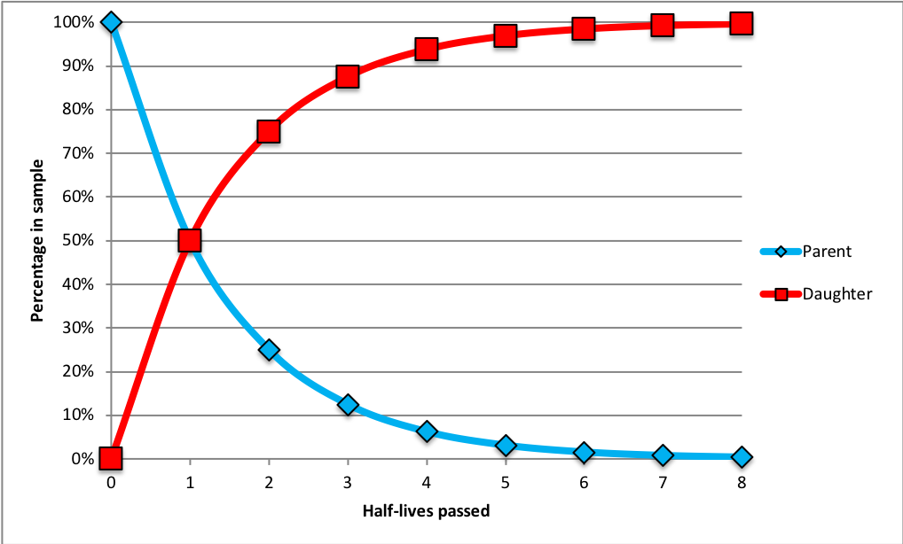 If we know the rate at which an isotope decays, we can calculate the age of a specimen given the fraction of parent and daughter isotopes in the sample. The percentage of the daughter isotope increases at the same rate as the parent isotope decreases, as shown in Figure 5.