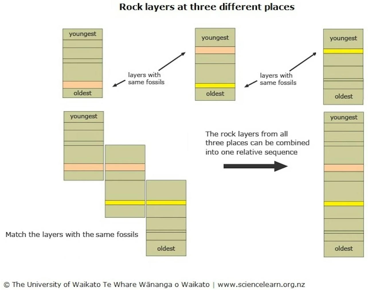 Relative dating is based on a number of principles, the most fundamental of which is that in an undisturbed sequence of sedimentary strata, the oldest layers are on the bottom and the layers above are younger. This is a consequence of the deposition of sediments over time. Fossils can then be used to align sedimentary strata from different locations. Unlike (most) types of rock, living organisms appear for a while in the fossil record and then go extinct, so fossils of the same type in rocks from different regions have roughly the same ages. By matching layers with the same fossils, scientists can combine strata from many locations to construct a relative sequence. This is how the geological timescale was initially constructed.